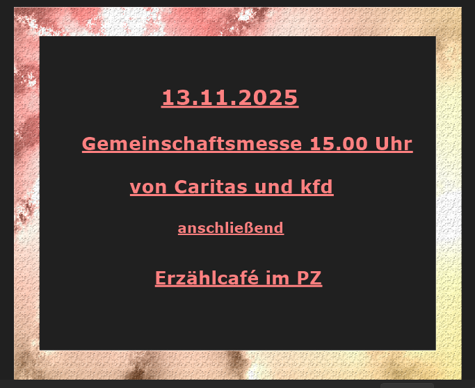 Die Gemeinschaftsmesse von kfd und Caritas wird jeden zweiten Donnerstag im Monat um 15:00 Uhr gefeiert.